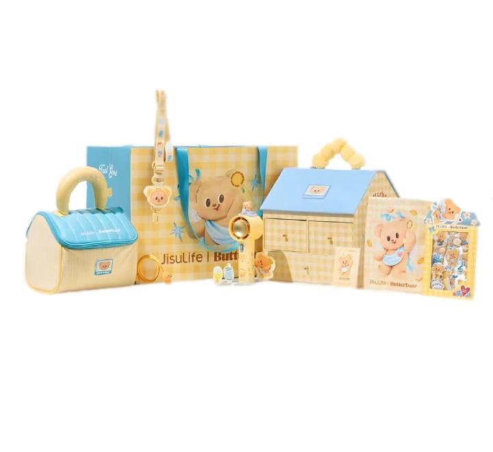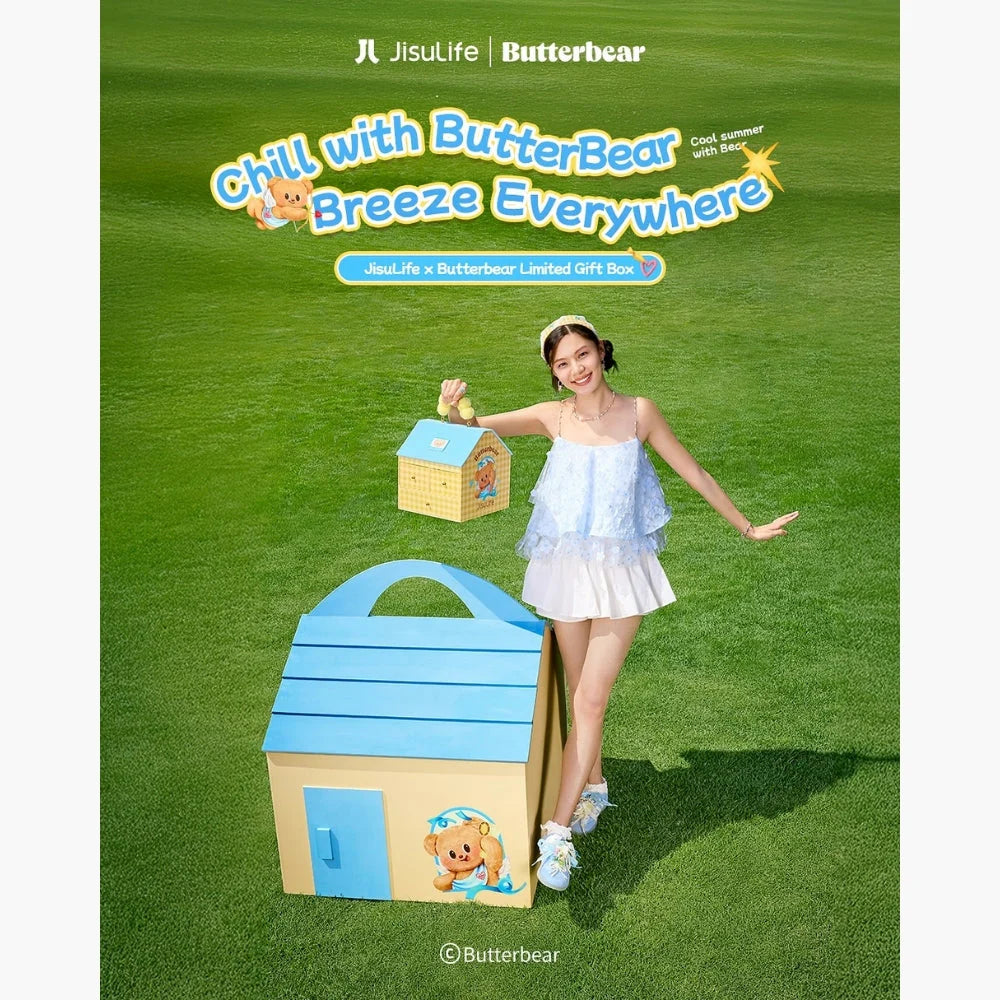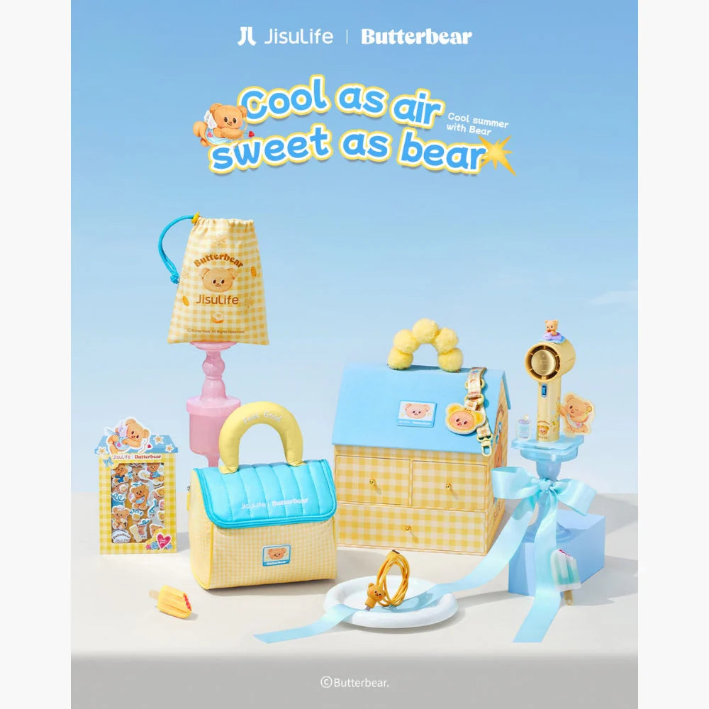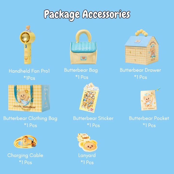 - Our cutie Butterbear handheld fan comes in a special gift box, containing a paper bag, container, a fluffy bag, and tiny accessories. All in Butterbear design!