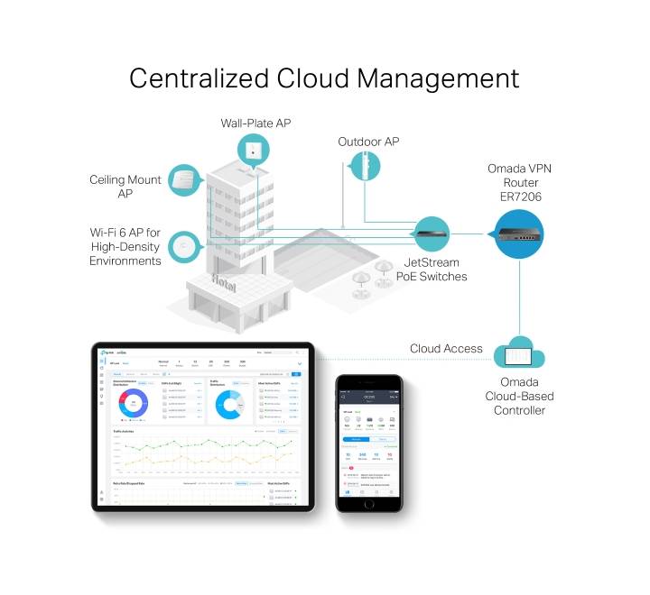 - Integrated into Omada SDN: Zero-Touch Provisioning (ZTP)**, Centralized Cloud Management, and Intelligent Monitoring.