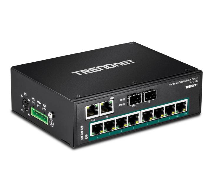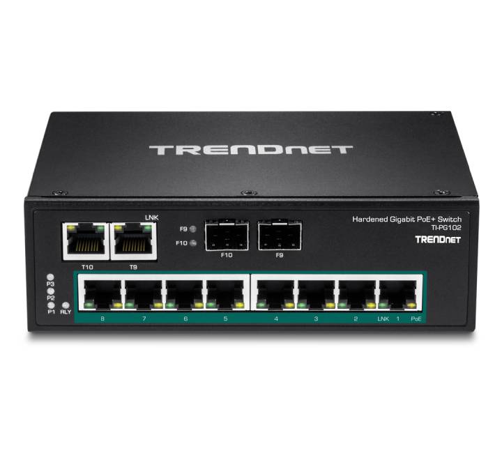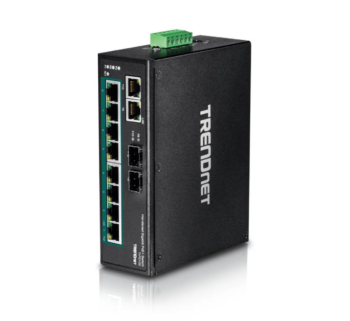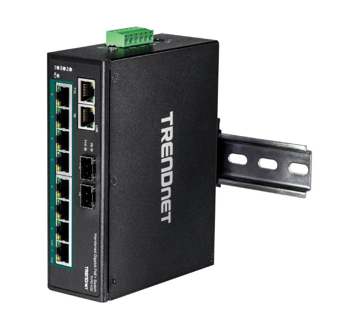 TRENDnet's 10-Port Industrial Gigabit PoE+ DIN-Rail Switch, model TI-PG102, has eight gigabit PoE+ ports with a 240 W PoE power budget, plus two gigabit RJ-45 / SFP shared ports. Users are able to connect eight PoE+ devices to the switch, while still providing two gigabit ports for additional network connections. The switch is equipped with an IP30 rated metal enclosure, designed to withstand a high degree of vibration and shock, while operating within a wide temperature range of -40° – 75°C (-40° – 167°F) for industrial environments.